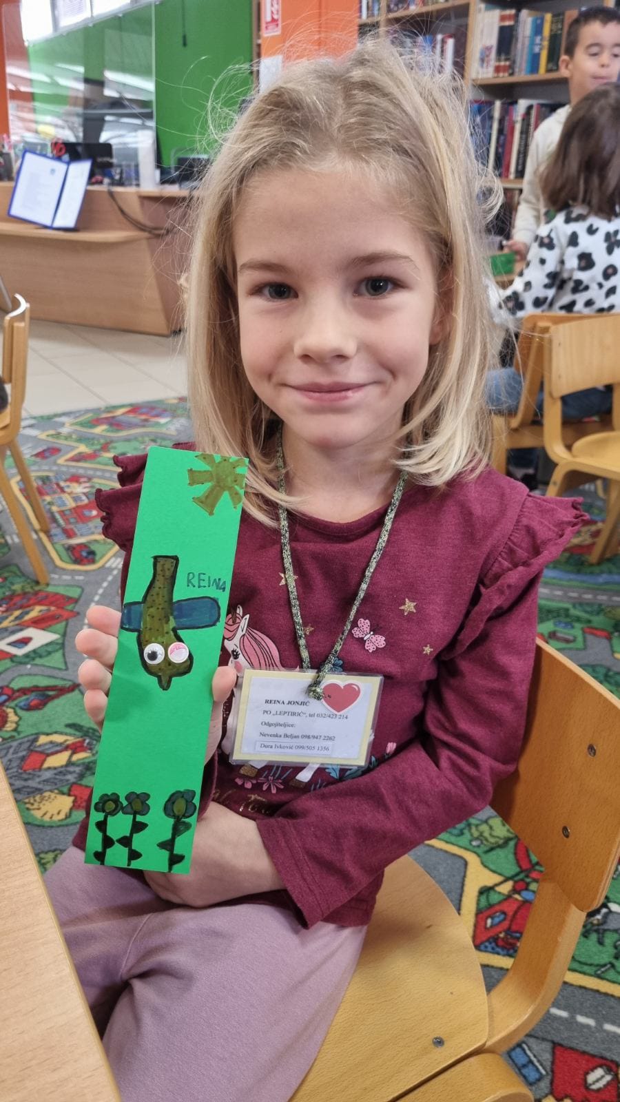 U drugom kreativnom dijelu radionice djeca su izrađivala straničnike, djevojčice ljubičaste, a dječaci plave. Svatko je na svoj straničnik zalijepio svoj izabrani papirić osjećaja. Djeca su na kraju knjižničarima otpjevali pjesmicu po izboru.