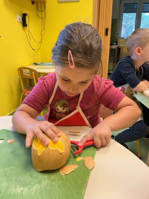 Bogatstvo jeseni u seoskom okruženju daje djeci brojna iskustva vezana uz zemlju i plodove ljudskog rada. Tako u listopadu obilježavamo Dane zahvalnosti za plodove zemlje pa nam za Dane kruha u Vrtić dolaze mame i bake mijesiti s nama, a potom i svećenik na Blagoslov kruha. Različitim aktivnostima obilježavamo Dane jabuka, a najslađa je izrada voćne kašice u kojoj svi rado sudjeluju. I bundeve koje su rodile u našim vrtovima bile su nam zanimljiva tema pa smo se i mi okušali u spravljanju Juhe od bundeve, baš kao mačak, vjeverica i patak iz iste priče! Ova nam se jesen pokazala kao topla i iznimno slatka!