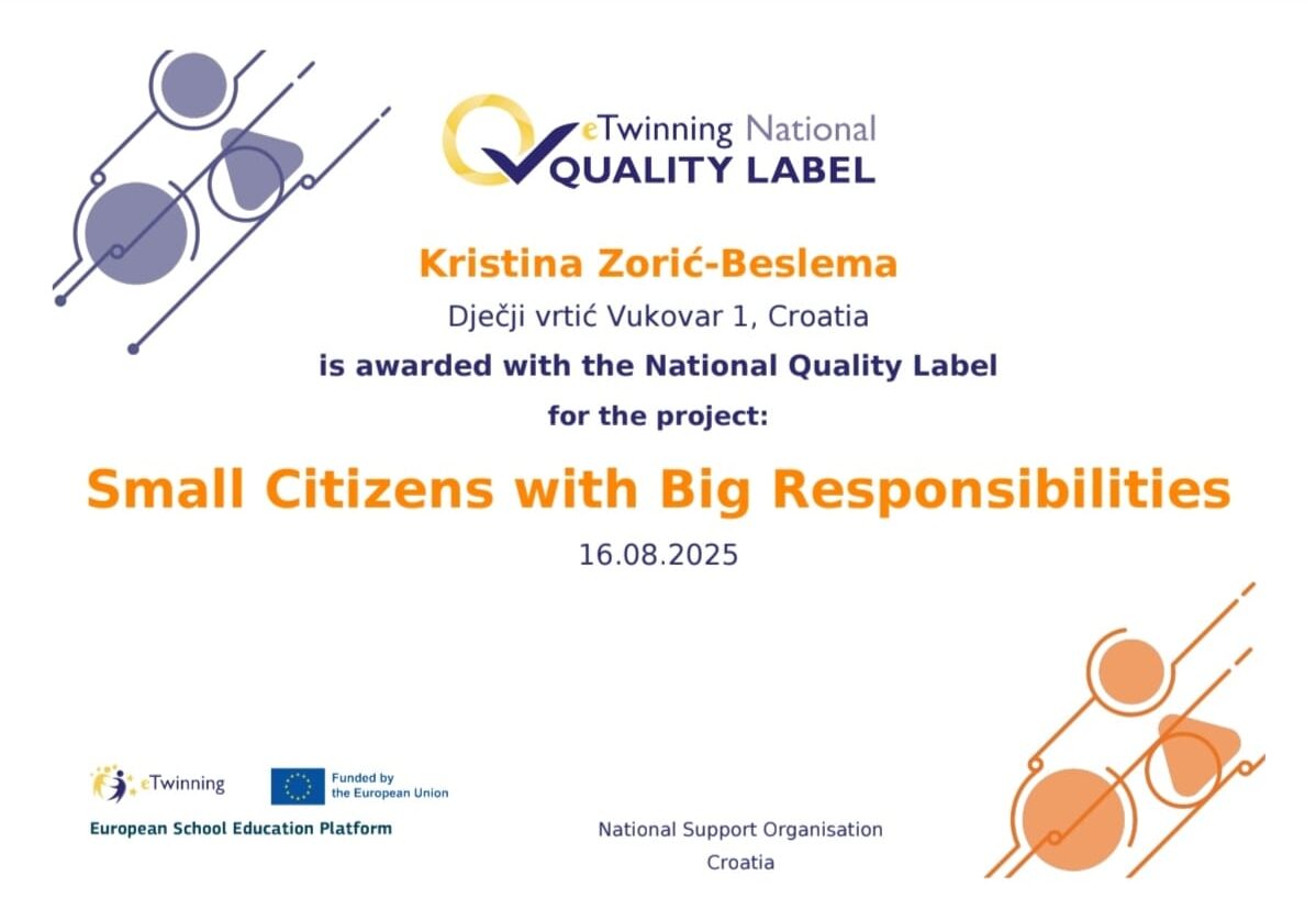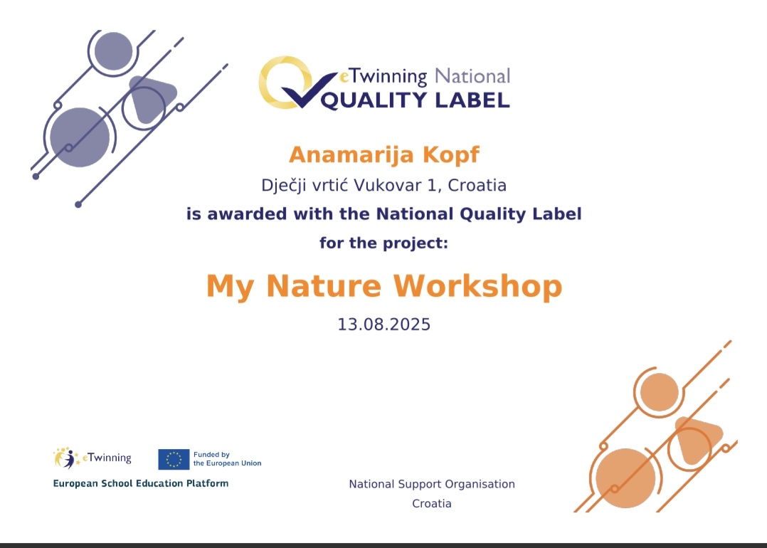 Ponosno objavljujemo kako su odgojiteljica Anamarija Kopf i odgojiteljica savjetnica Kristina Zorić Beslema osvojile Nacionalnu nagradu kvalitete za svoje projekte koje su provodile u pedagoškoj godini 2024./2025.