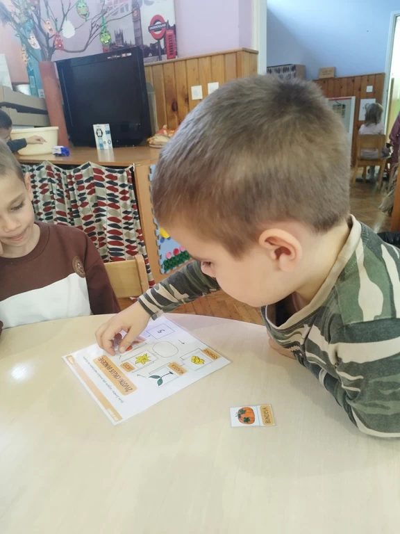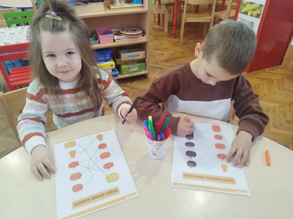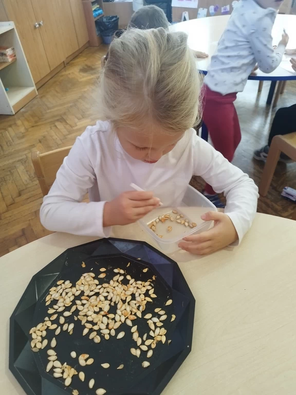 Djeca su promatrala bundeve, uspoređivala veličinu, oblik i boju. Čistili su bundeve od sjemenki, a zatim su se igrala sjemenkama bundeve – prebirala ih, prenosila, uspoređivala količine i brojala. Na taj način poticali smo rano matematičko mišljenje i opažanje.