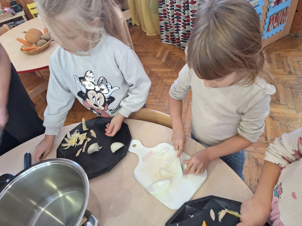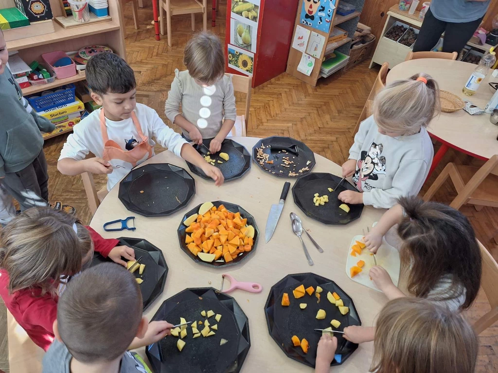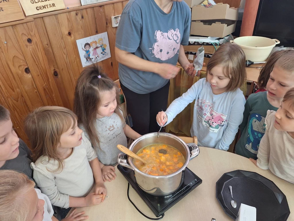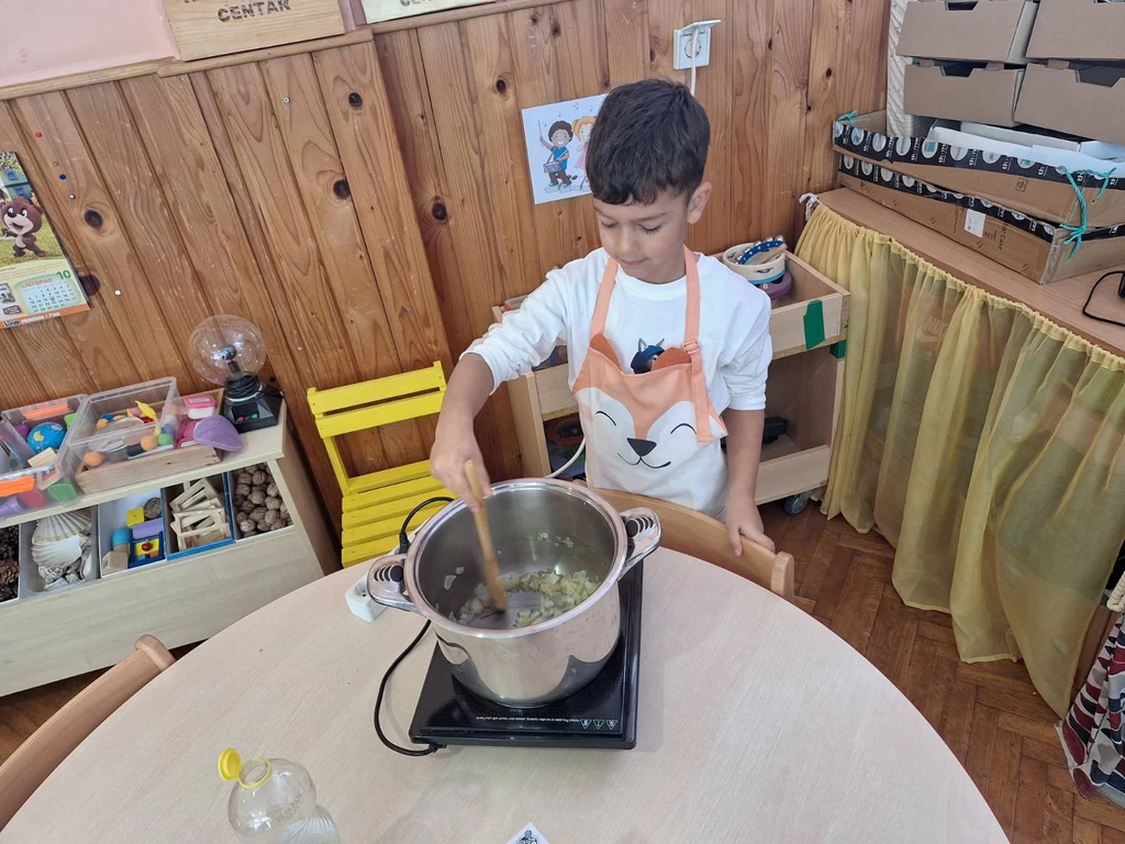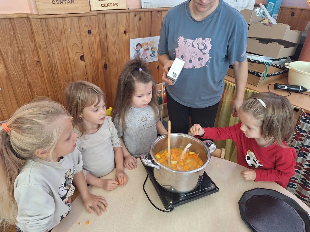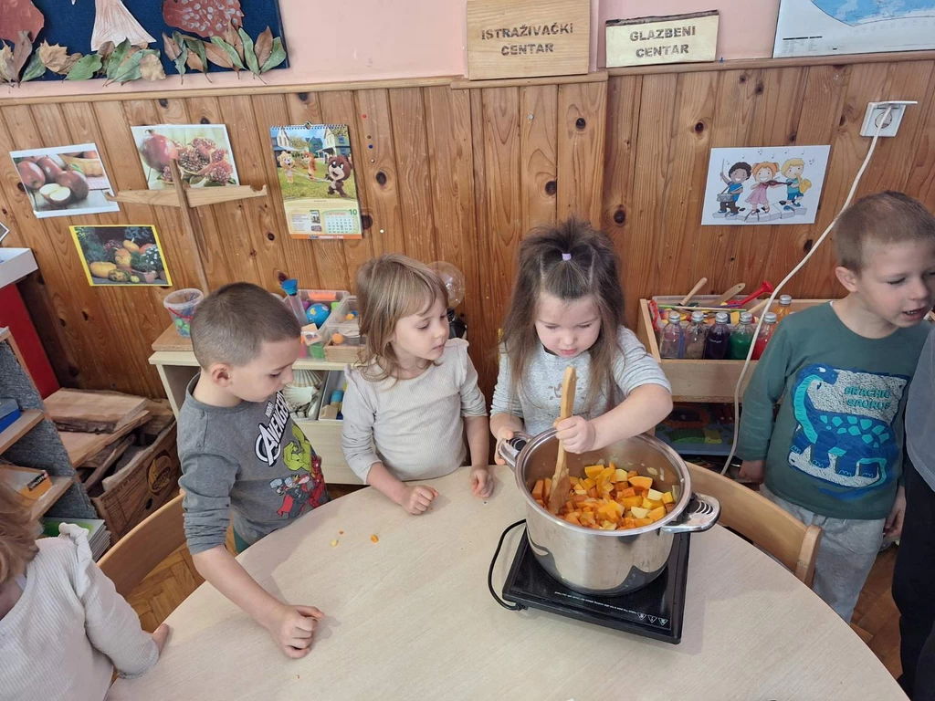 Posebno zanimljiva aktivnost bila je priprema juhe od bundeve. Djeca su aktivno sudjelovala u kuhanju – promatrala proces pripreme, gulili i rezali povrće, imenovala namirnice, mirisala i kušala sastojke. Nakon kuhanja su kušala juhu od bundeve, razgovarala o njezinu okusu, boji i mirisu te izražavala vlastite dojmove. Aktivnost je pridonijela razvoju svih osjetila, jezičnom izražavanju i pozitivnom odnosu prema zdravoj prehrani.