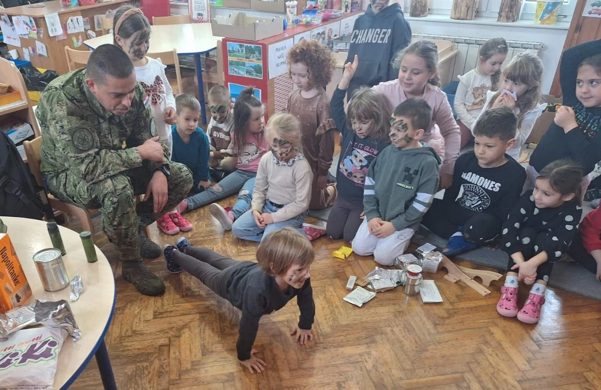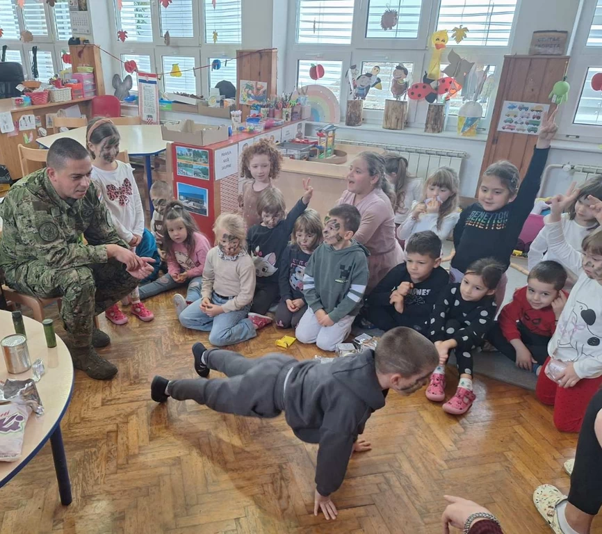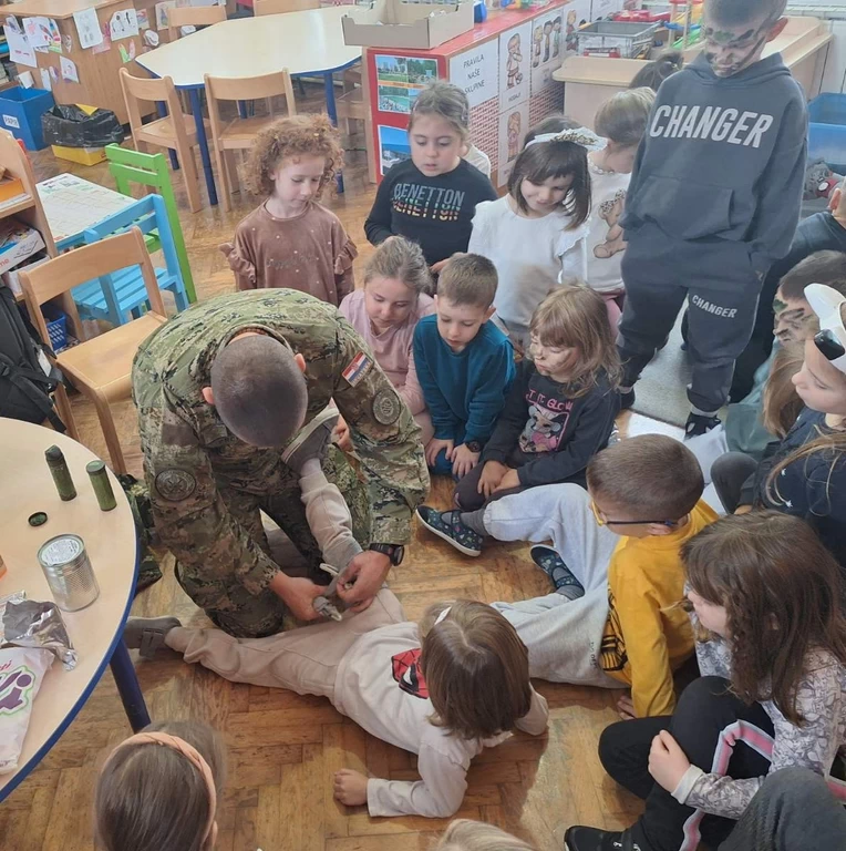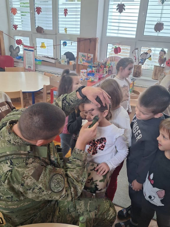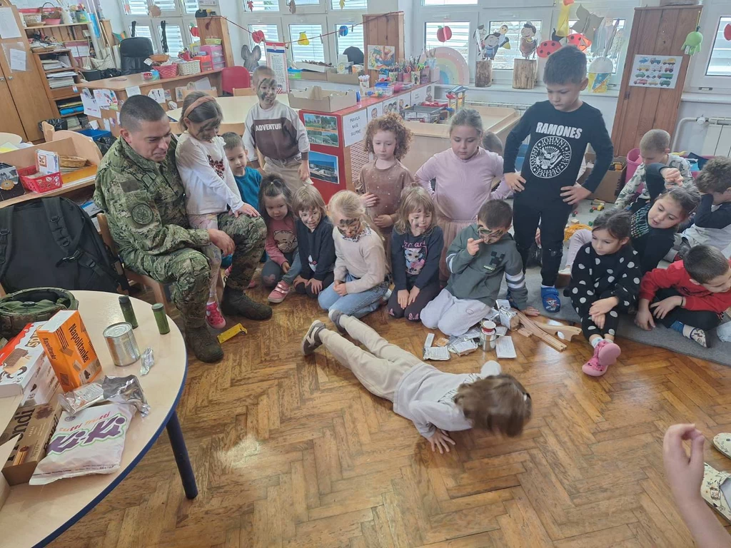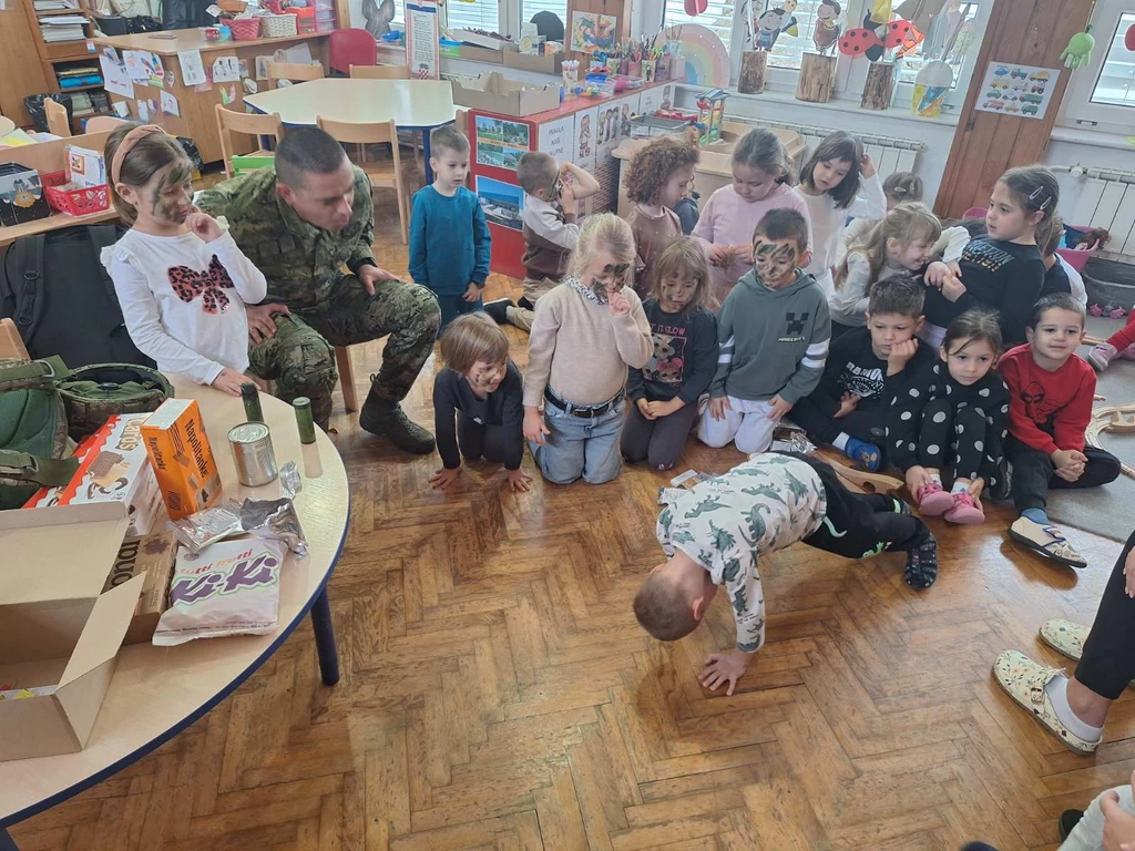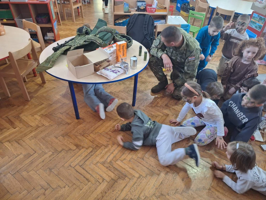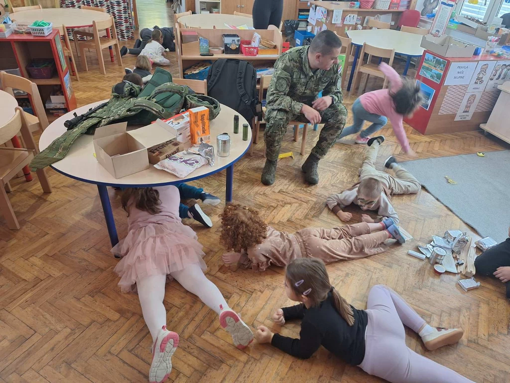 Tata vojnik djeci je na primjeren i razumljiv način predstavio što je vojska i koje zadaće obavlja. Pokazao im je primjerke neopasne vojne opreme i demonstrirao jednostavne vježbe u koje su se rado uključila i djeca.