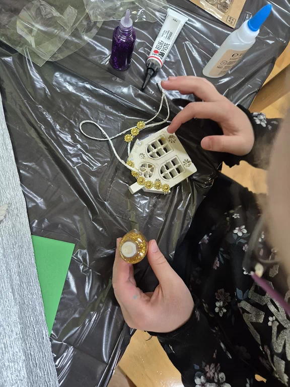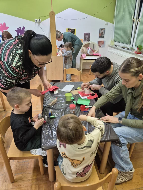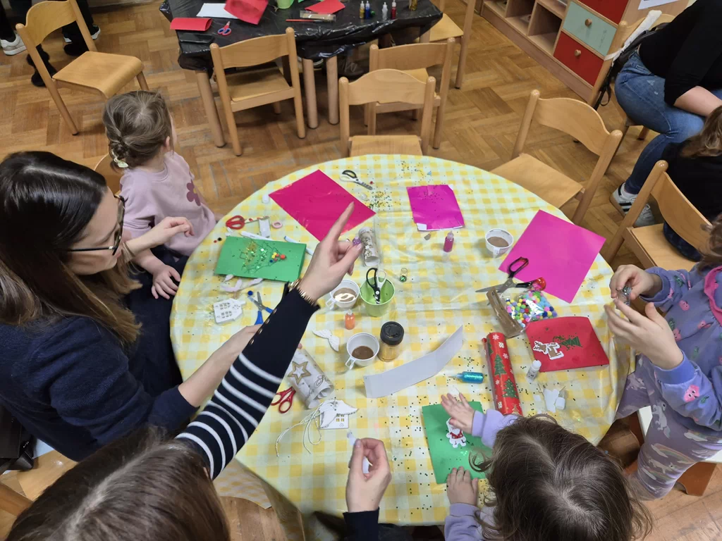 Djeca su sa svojim roditeljima izrađivala božićne čestitke i kuglice pri čemu su poticani na razvijanje kreativnosti i mašte te na razvoj fine motorike i osjećaj ponosa zbog zajedničkog stvaranja.