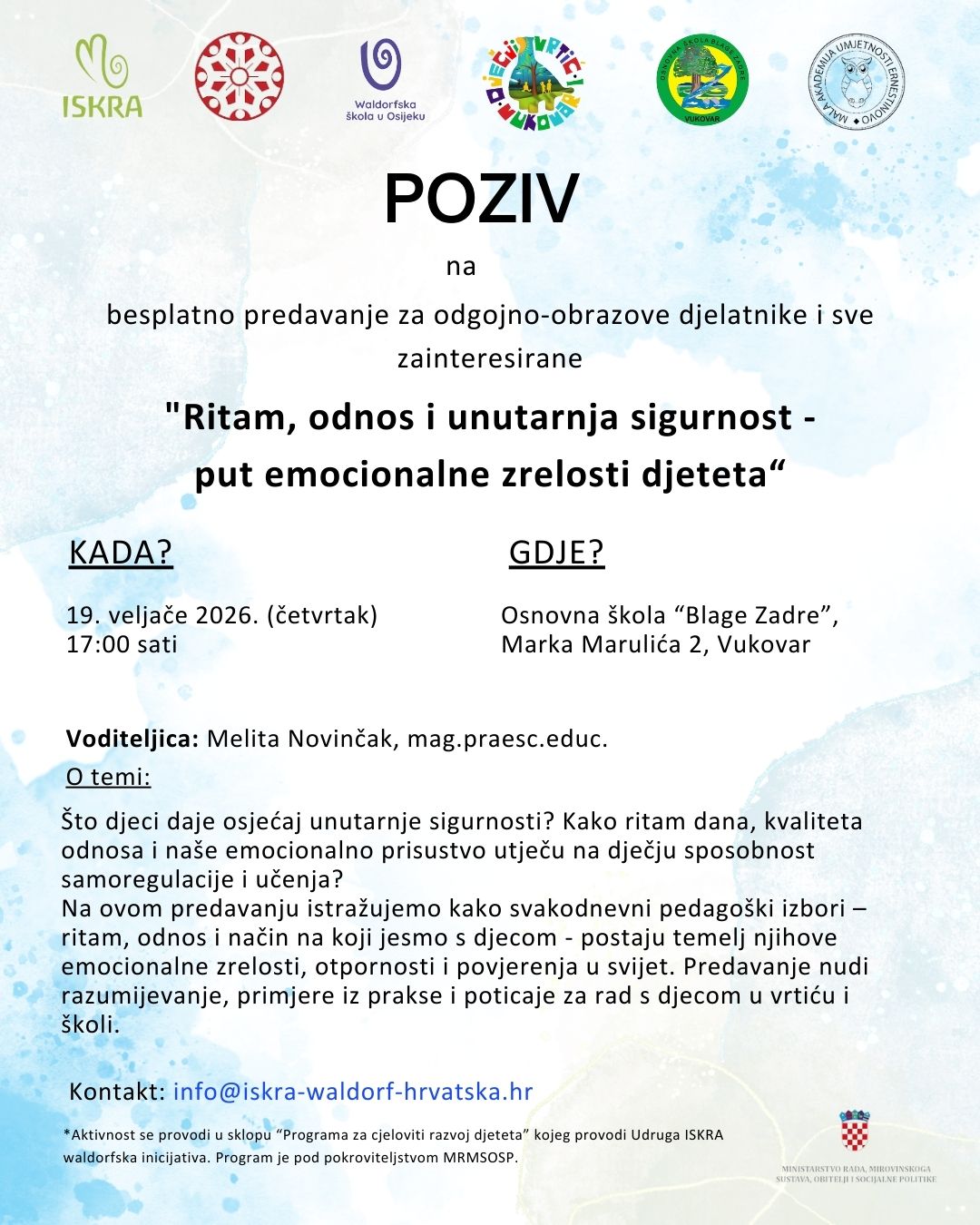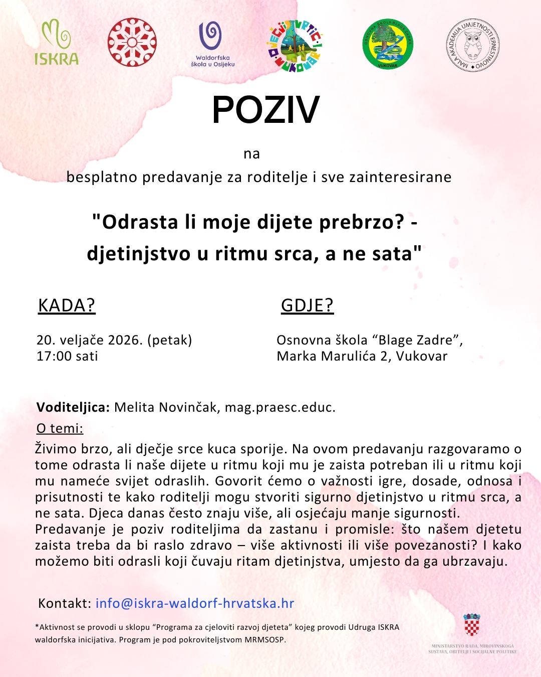 Udruga ISKRA Waldorfska inicijativa organizira dva besplatna predavanja koja će se održati u Vukovaru, u Osnovnoj školi „Blage Zadre“ (Marka Marulića 2) 19. i 20. veljače. Ukoliko ste zainteresirani možete se prijaviti za sudjelovanje putem dolje navedenih online obrazaca.