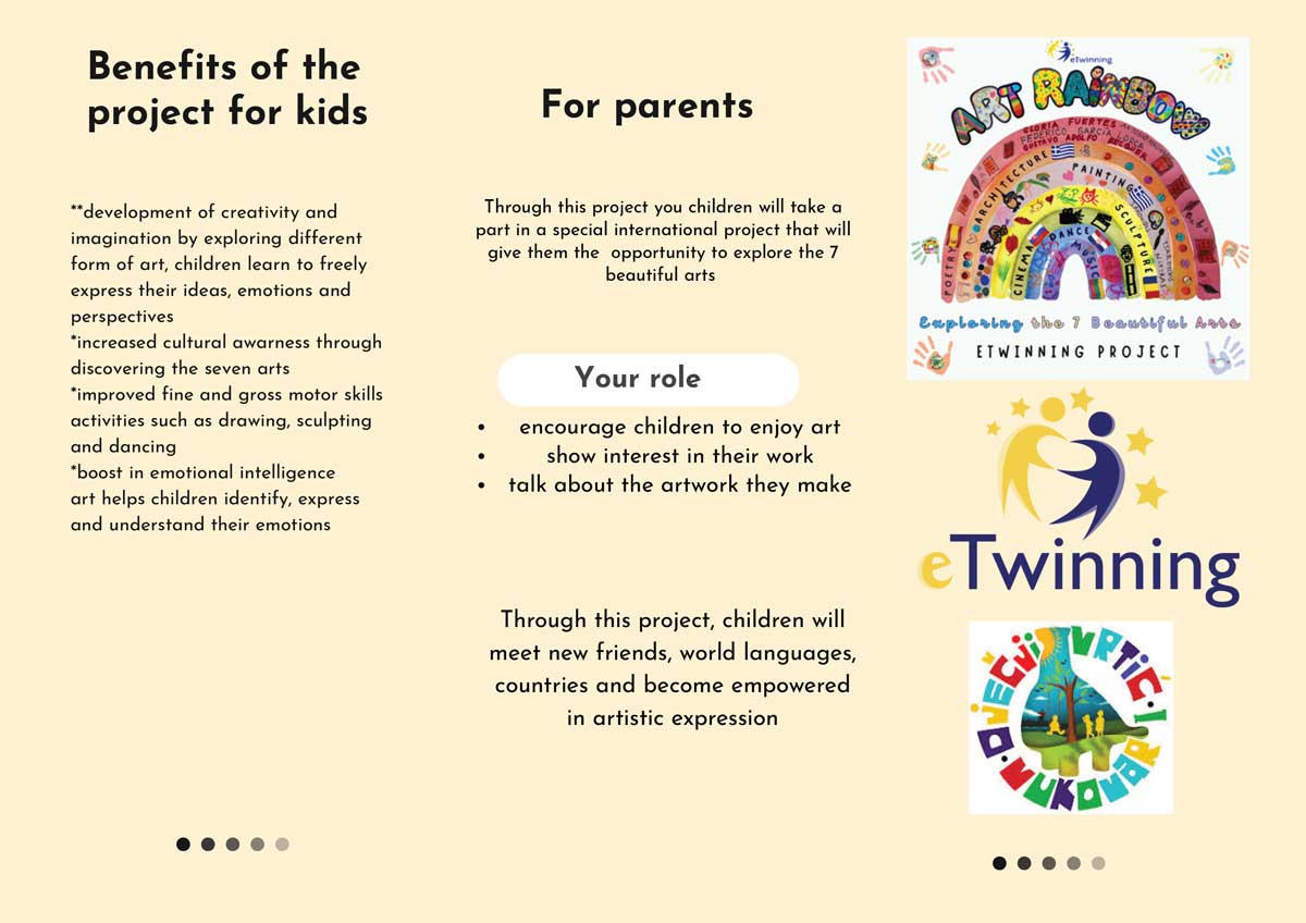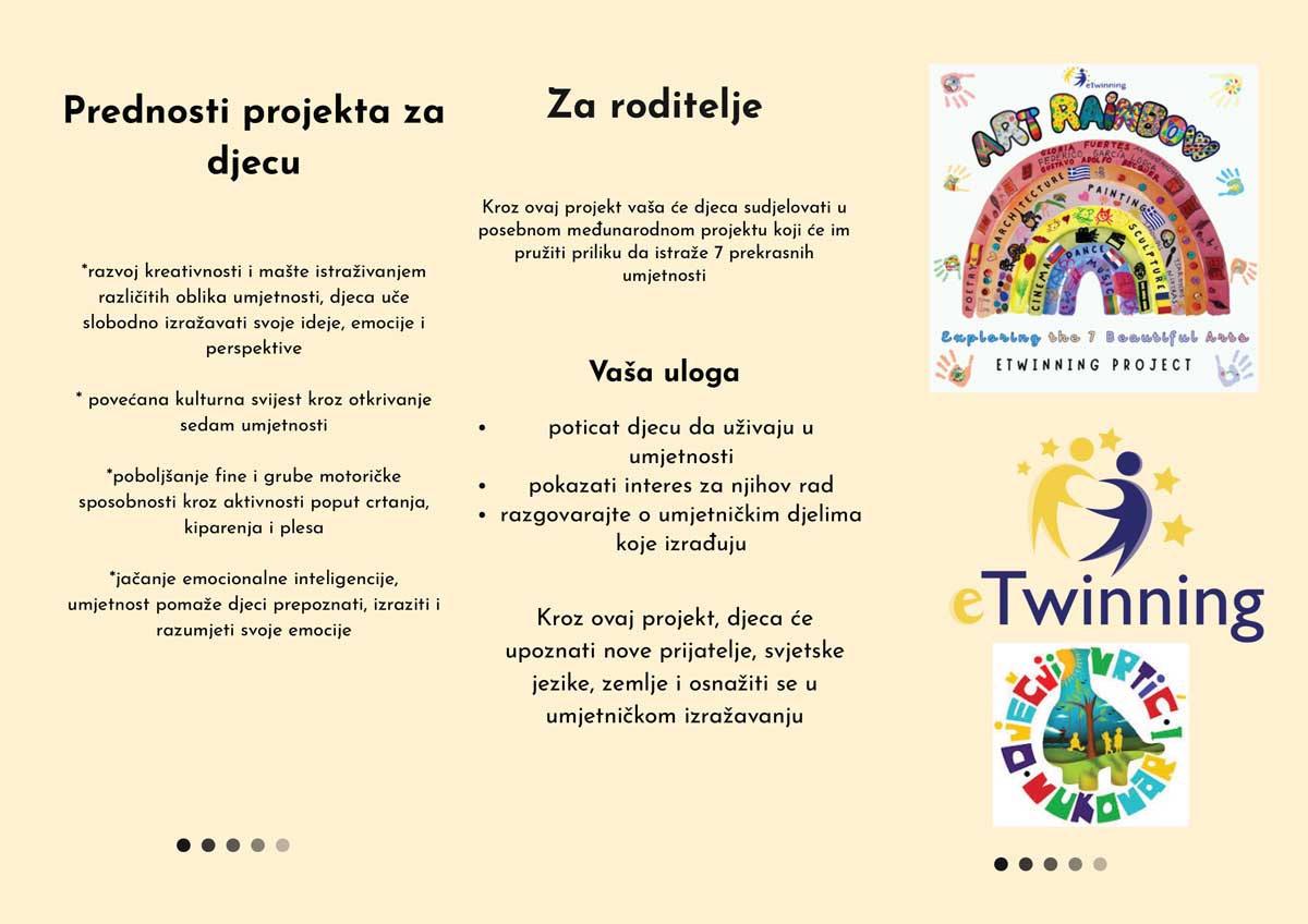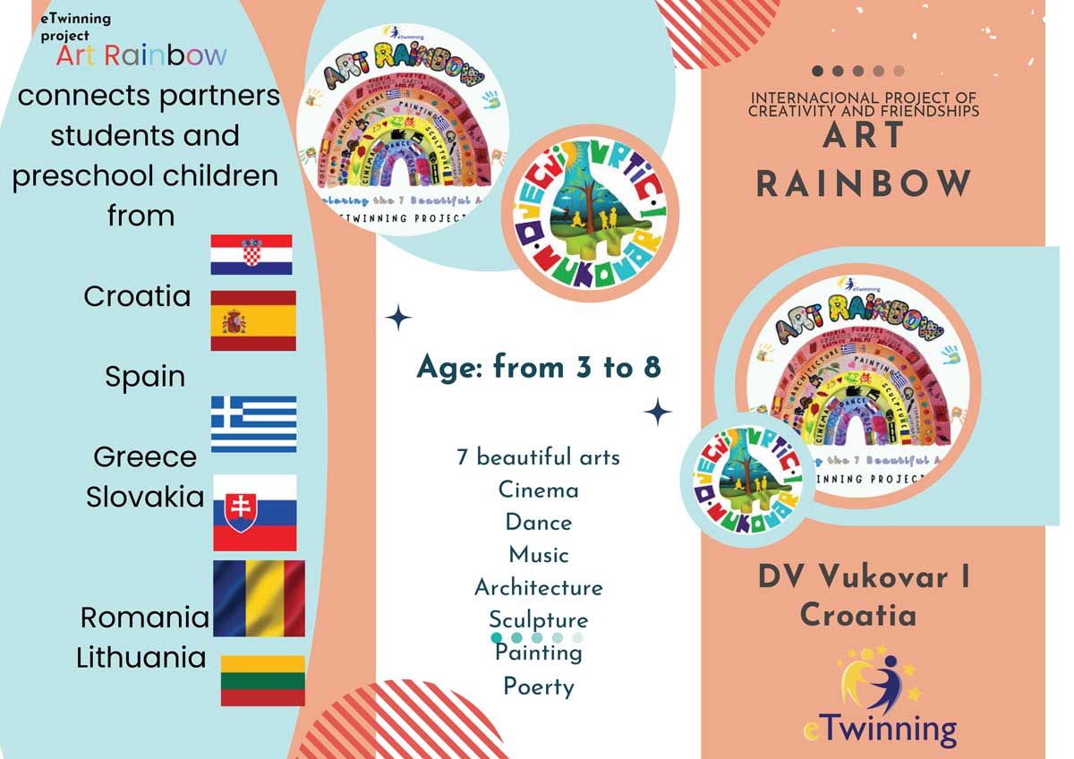 Tijekom mobilnosti u Livorno (Italija) nastala je ideja i poznanstva za novi projekt pod nazivom ART RAINBOW. U projektu sudjeluju partneri iz Španjolske, Litve, Rumunjske, Slovačke, Grčke i Italije. Kroz projekt istražujemo sedam umjetnosti, upoznajemo nove prijatelje, kulture i jezike, a isto tako predstavljamo naš Vrtić, grad i našu domovinu. Kroz projekt kod djece želimo potaknuti izražavanje u slikarstvu, plesu, pjevanju, modeliranju, glumi i poeziji a sve kroz uporabu dostupnih i prirodnih materijala. Ovim projektom naš vrtić, a i grad Vukovar svrstavamo u eTwinning mapu dobrih ideja i primjera iz prakse.